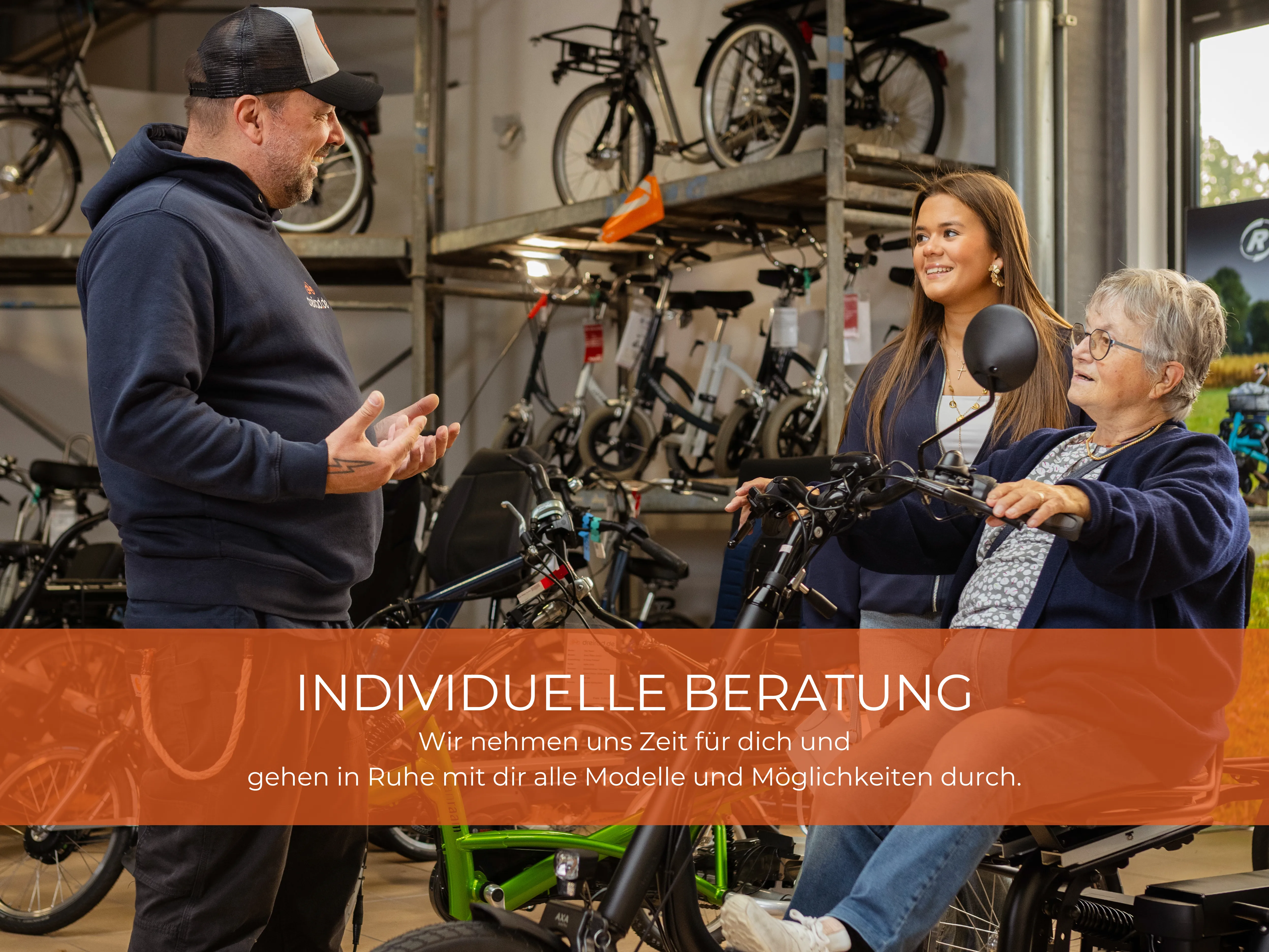 Gerne nehmen wir uns immer die Zeit, Sie ausführlich zu beraten. Mit einem breit gefächerten Sortiment von Dreirädern, Rollstuhlfahrrädern, Tandems, Liegerädern, Lastenrädern, Kompakträdern und weiteren Spezialfahrrädern für Senioren, Erwachsene oder Kinder, mit oder ohne körperliche Behinderungen, gesund oder erkrankt, in Rehabilitation oder genesen.